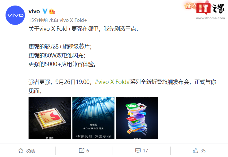 In April, Vivo launched Vivo X Fold phone, priced from 8,999 yuan. Yesterday, Vivo officially announced that it will release its Vivo X Fold iteration product — Vivo X Fold + foldable phone — on September 26. Today, Vivo official brought the machine warm-up information.