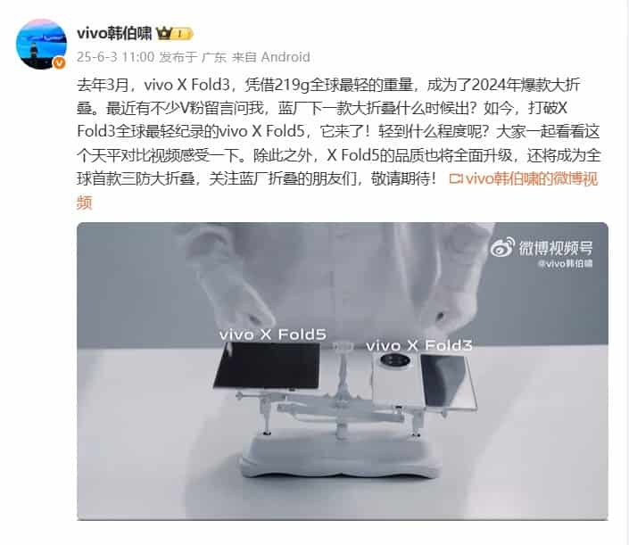 Just now, Han Boxiao, the product manager of vivo, released some information about the vivo X Fold5, stating that the vivo X Fold5 will break the record of the world’s lightest large folding (inner folding) phone set by the X Fold3 (219g). Meanwhile, the quality of the new device has been comprehensively upgraded and it will become the world’s first three-proof large folding device.