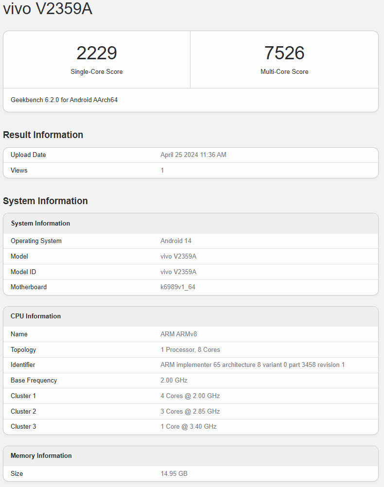In Geekbench 6.2.0, the new machine achieved a single-core score of 2229 and multi-core score of 7526. The test model is equipped with Android 14, 16GB of memory, and the CPU is composed of 1 3.40GHz core + 3 2.85GHz core + 4 2.00GHz core, which is consistent with the previously exposed Dimensity 9300 + processor.