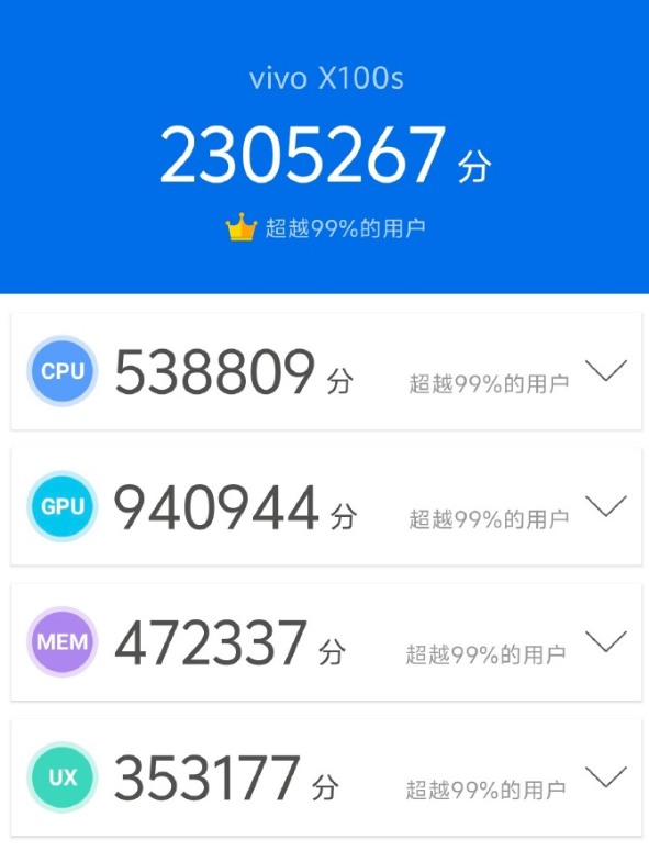 vivo product manager Han Boxiao shared the picture shows that the new machine in Geekbench run score of single-core 2313 points, multi-core 7743 points, Antutu comprehensive run score up to 2305,267 points.