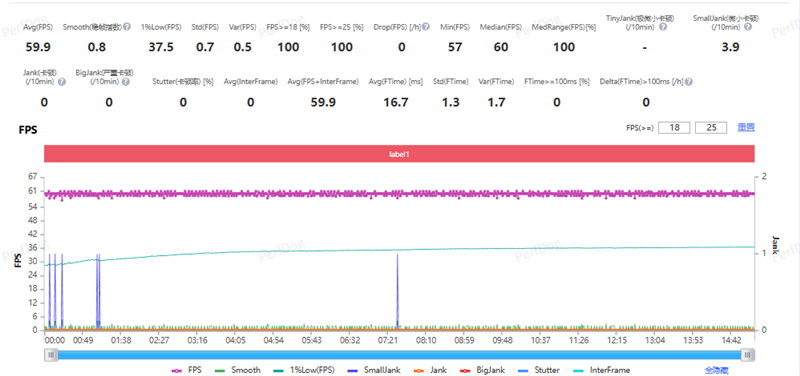 In Peace Elite (PUBG Mobile CN), the maximum available frame rate is 60fps. During a match on the island map, the Y500 Pro maintained an average of 59.9 FPS, with a frame stability index of 0.8. The 1% low frame rate dipped to 37.5 FPS, which is noticeably lower than what we saw in Honor of Kings but still within acceptable limits for this type of game.