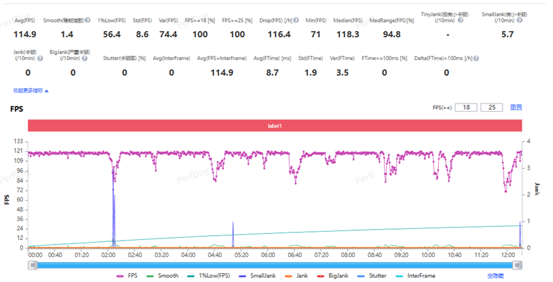 With settings pushed to high definition and 120fps enabled, we ran a full 5v5 ranked match replay. During the test, the game delivered an average frame rate of 114.9 FPS, with a frame stability rating of 1.4. Even the 1% low frame rate is held at 56.4 FPS. Regular laning was consistently smooth, though the frame rate dipped slightly during big team clashes, yet still never dropped below 71 FPS, which is remarkably stable for a mid-range device.