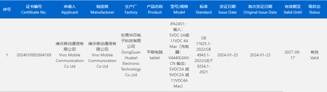 Igeekphone January 29 news, vivo has a model of “iPA2451” tablet computer products through the national 3C quality certification, support 44W fast charge, with V4440L0A0-CN charger, by Dongguan Huabai Electronic Technology Co., LTD foundry.