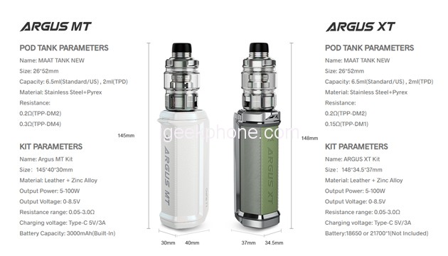 In terms of device chip, the latest intelligence chip applied in the mod system, GENE.TT 2.0, could switch matching powers automatically to support users with 4 vaping modes such as Smart,RBA, TC and Turbo. The upgraded Turbo mode realizes a 12% wattage increase at the first second of fire and a 25% enhancement of vaping eruption. ARGUS MT is equipped with the Battery Management System (BMS) monitoring the real-time temperature of the built-in 3000mAh battery. ARGUS XT uses a system that intelligently identifies the battery and matches the optimal output wattage.