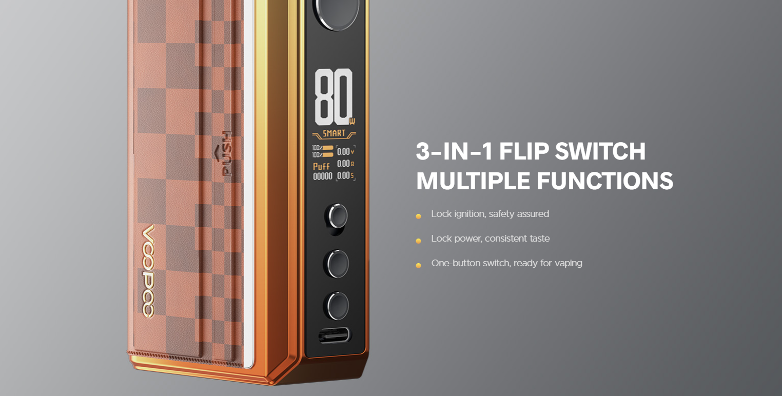 The DRAG 5 also includes a 3-in-1 flip switch, enabling quick control over ignition lock, power lock, and device activation. This hardware-based control system offers tactile usability that many experienced vapers appreciate.