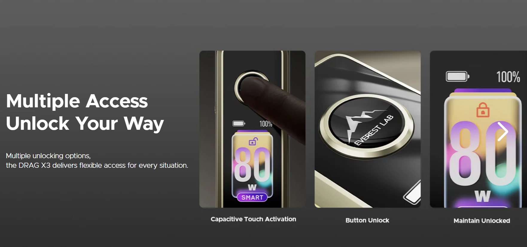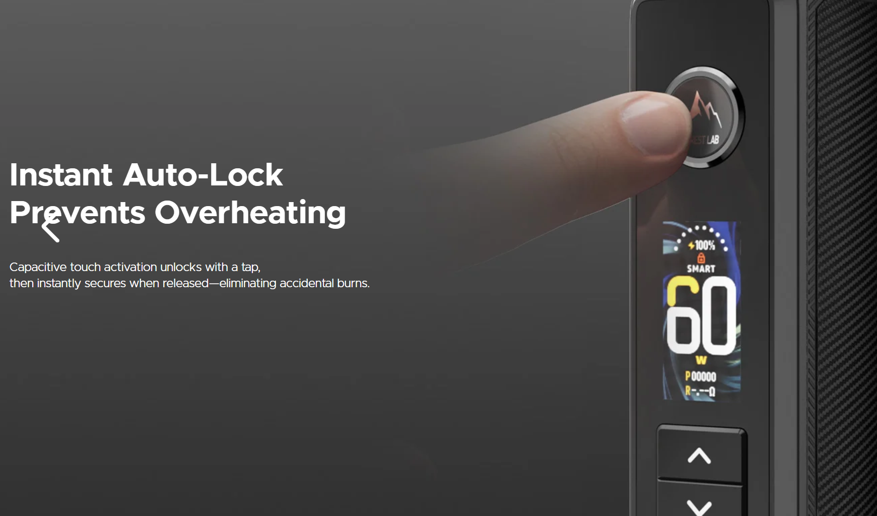 The DRAG S3 maxes out at 60W, powered by its 3000 mAh battery. It’s efficient and consistent, offering 25% longer runtime compared to previous models of this size. The capacitive unlock sensor is a neat touch — you simply tap to unlock and vape, and it auto-locks when you release, preventing accidental activation in your pocket.