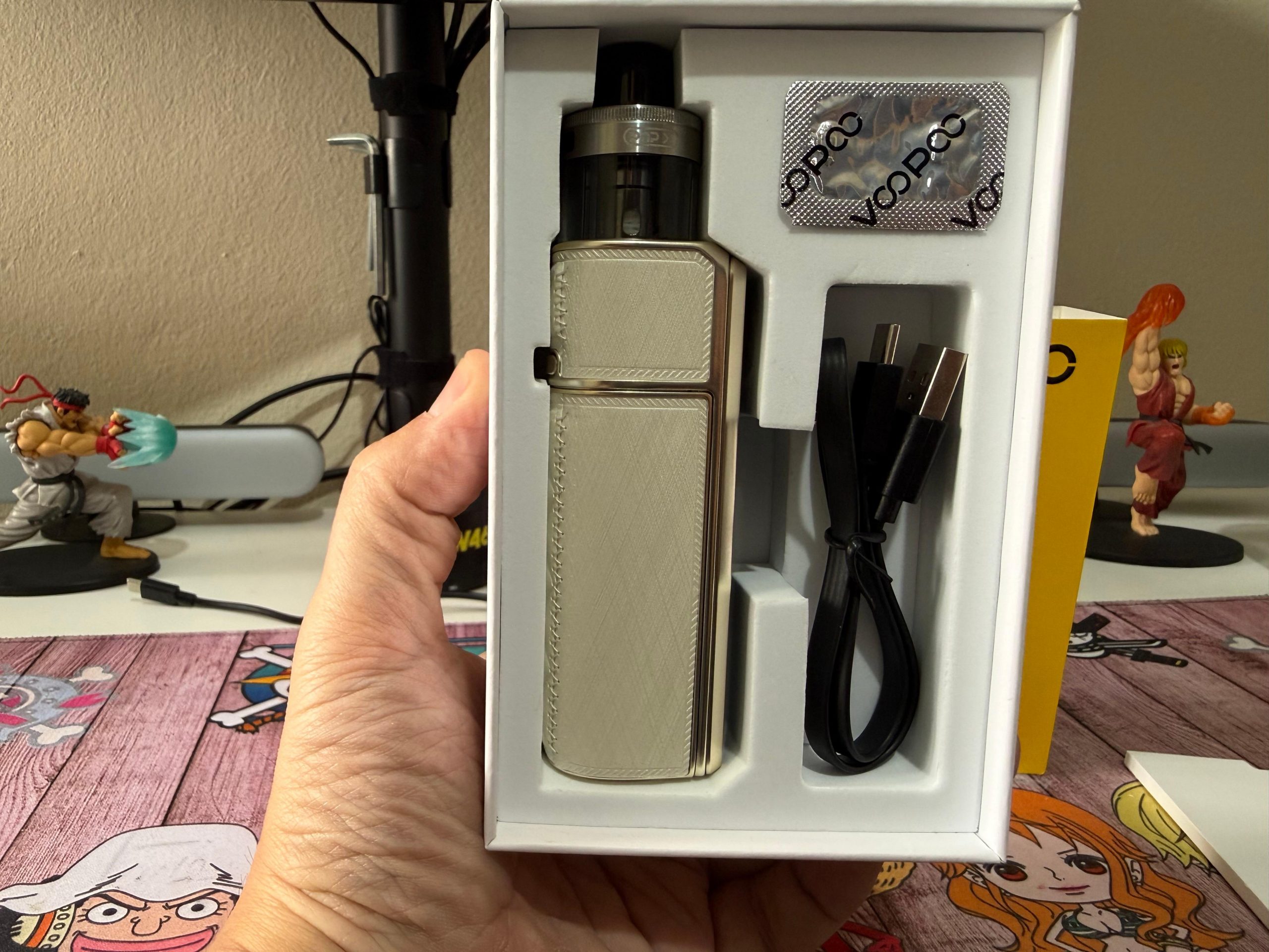 Solid build quality: the zinc alloy + leatherette gives a premium feel. Because of the swappable battery design, the device is a bit taller/heavier than simpler pod kits, but remains portable.