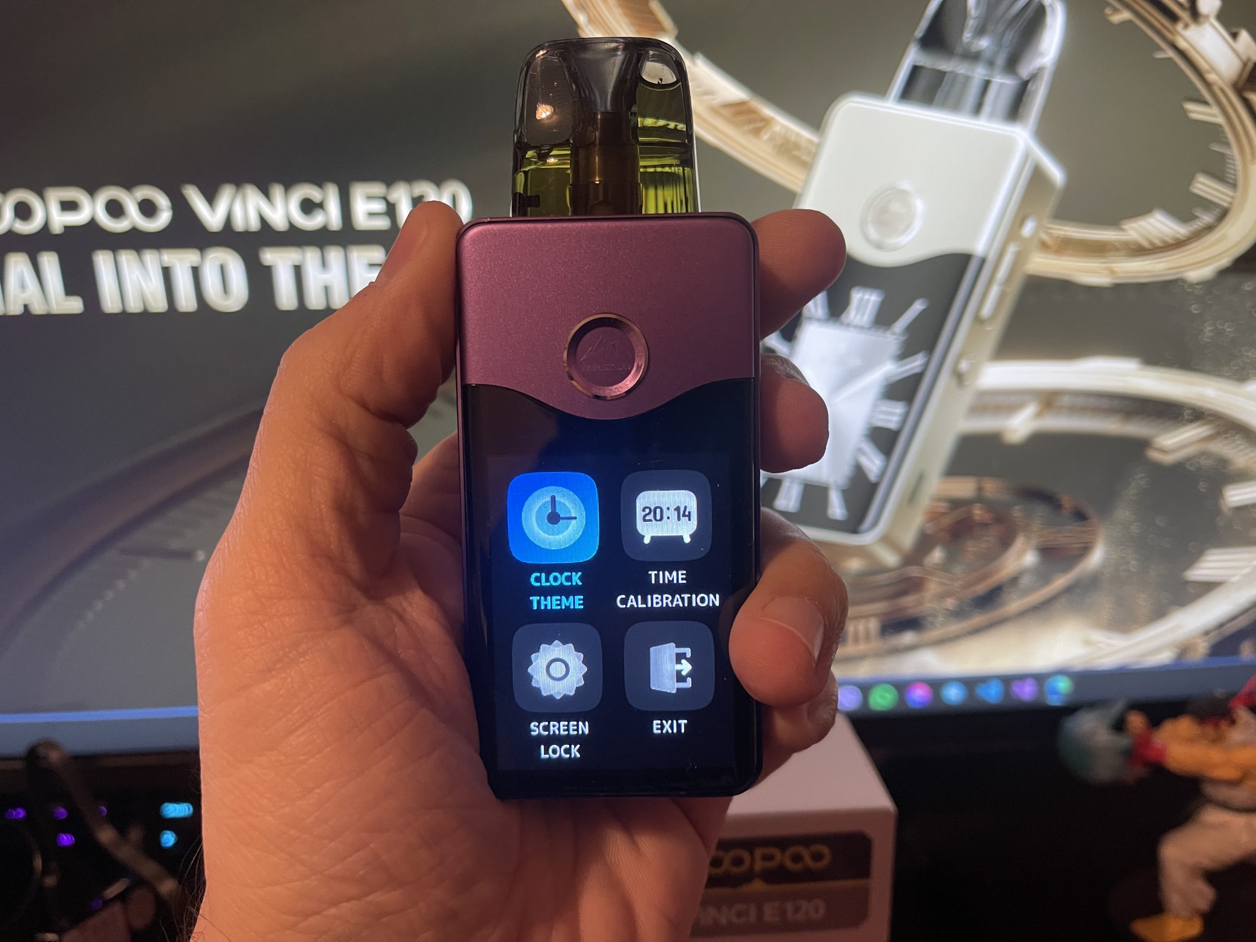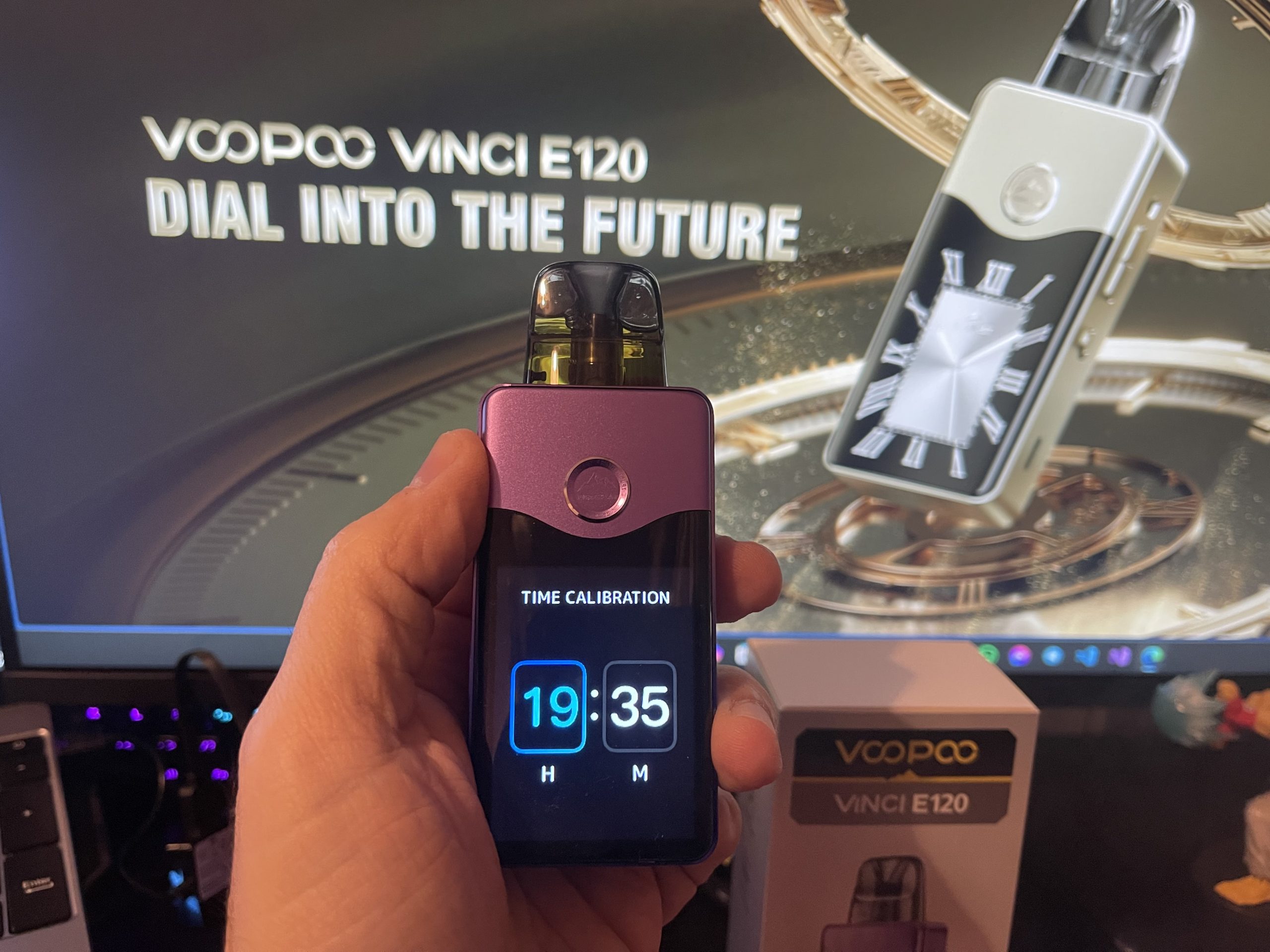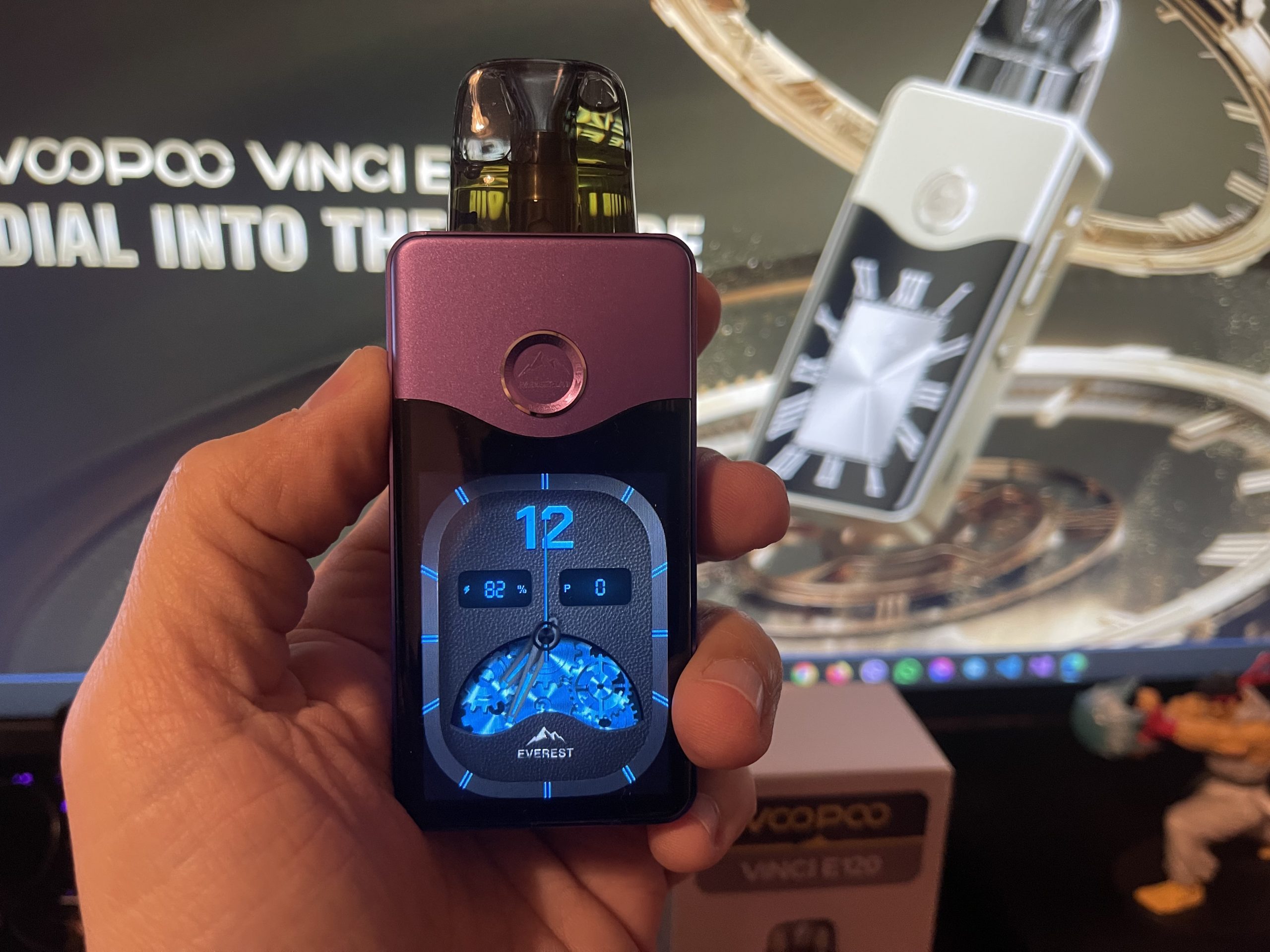 The VOOPOO Vinci E120 exudes modern sophistication with its sleek aluminum alloy body, gold-trimmed accents, and lightweight yet durable construction. The 2.4-inch TFT screen is not only large but also fully customizable, offering 18 watch face options that unlock as you continue vaping.