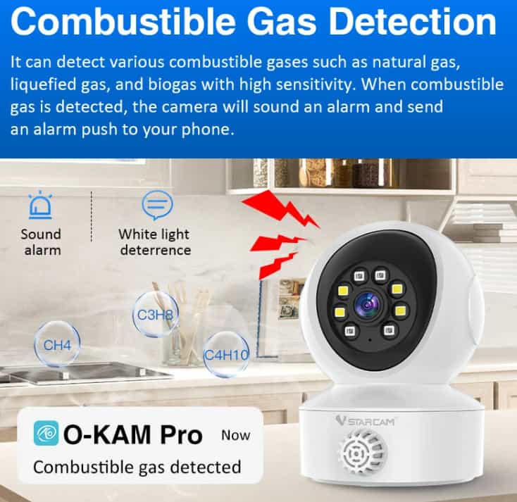 This is the feature that truly redefines the camera’s purpose. The Vstarcam C49LM comes with a built-in Smoke and Gas Detector. While you sleep, the camera doesn’t. It continuously samples the air, and if it detects smoke or dangerous levels of combustible gas (like from a leak), it will immediately send a loud, audible alarm and a critical alert directly to your smartphone.