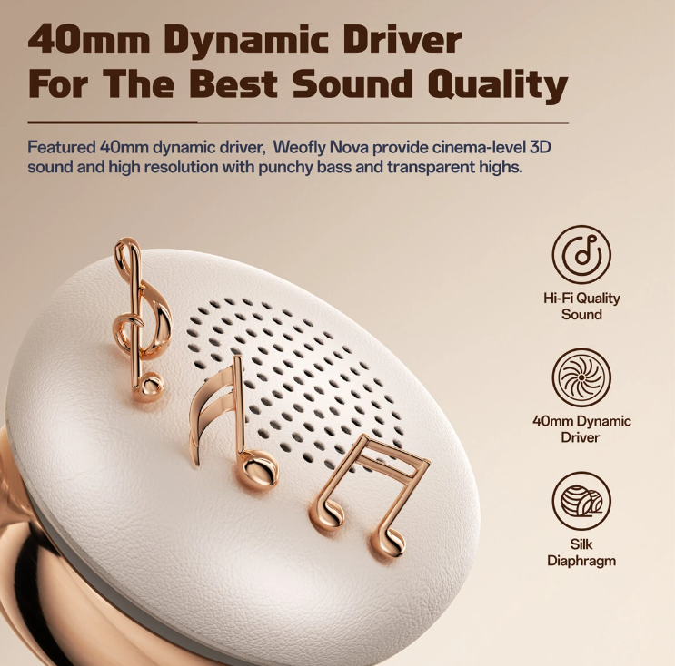 - Powerful 40mm Dynamic Drivers: At the heart of the Weofly Nova are 40mm dynamic drivers that deliver rich, balanced sound with deep bass, clear mids, and crisp highs. Whether you’re listening to classical music, heavy metal, or podcasts, these drivers provide an immersive audio experience that will satisfy even the most discerning audiophiles.