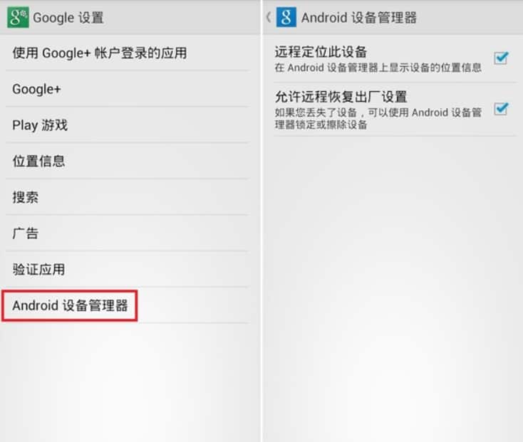 In the Google Services app, find the “Google Settings” app, select “Android Device Manager” within it, and check “Remotely Locate this Device” and “Allow Remote Restoration to Factory Settings”.