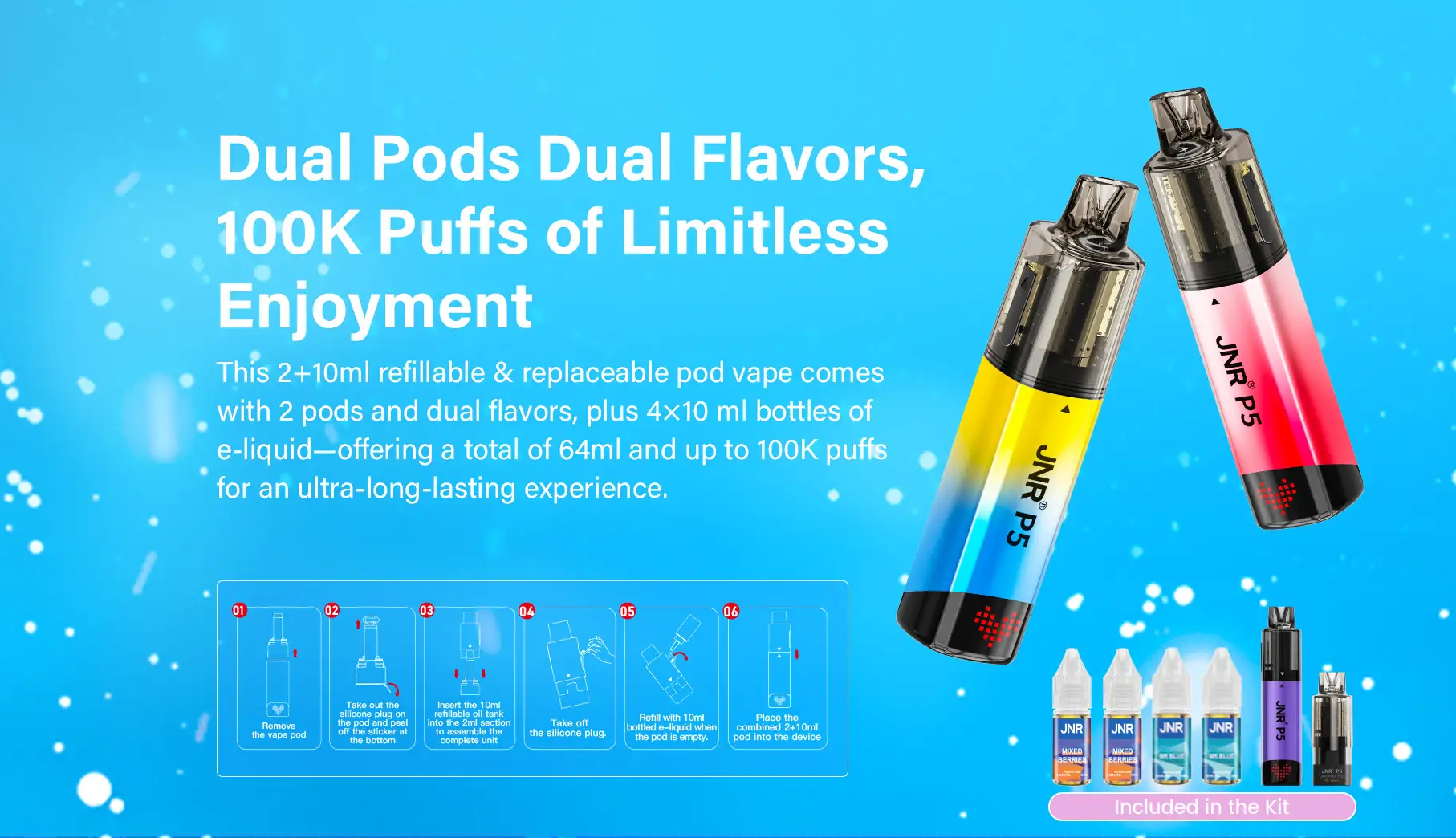 Design-wise, the JNR 100K P5 GlassRock is built with both convenience and endurance in mind. It comes with 2ml prefilled pods and 19ml refill containers, giving users the best of both worlds: ready-to-go pods and the flexibility to refill. With a total of 64ml of e-liquid included, this device feels more like a long-term investment rather than a short-lived gadget.