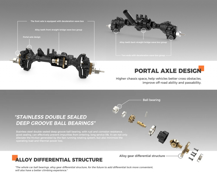 The Wltoys 104010 also boasts a door bridge design, which increases the chassis space and improves the vehicle’s passability over obstacles. Rubber tires provide excellent grip, and the car is equipped with ball bearings and an alloy gear differential structure, ensuring a smooth and responsive climbing experience.