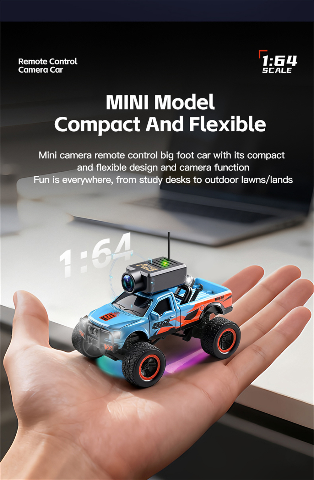 At first glance, the Wltoys 6407 looks like a stylish little collectible. Available in red and blue, this 1/64 scale RC car measures just 9.75 x 6.1 x 5.9 cm and weighs around 27.5 grams. Don’t let the small size fool you though, it’s built with quality ABS materials and packs in far more than you’d expect from something this tiny. The design feels premium for the price, with ambient underglow lighting, white roof lights, and directional turn signals that flash left or right when you steer. It genuinely looks the part.