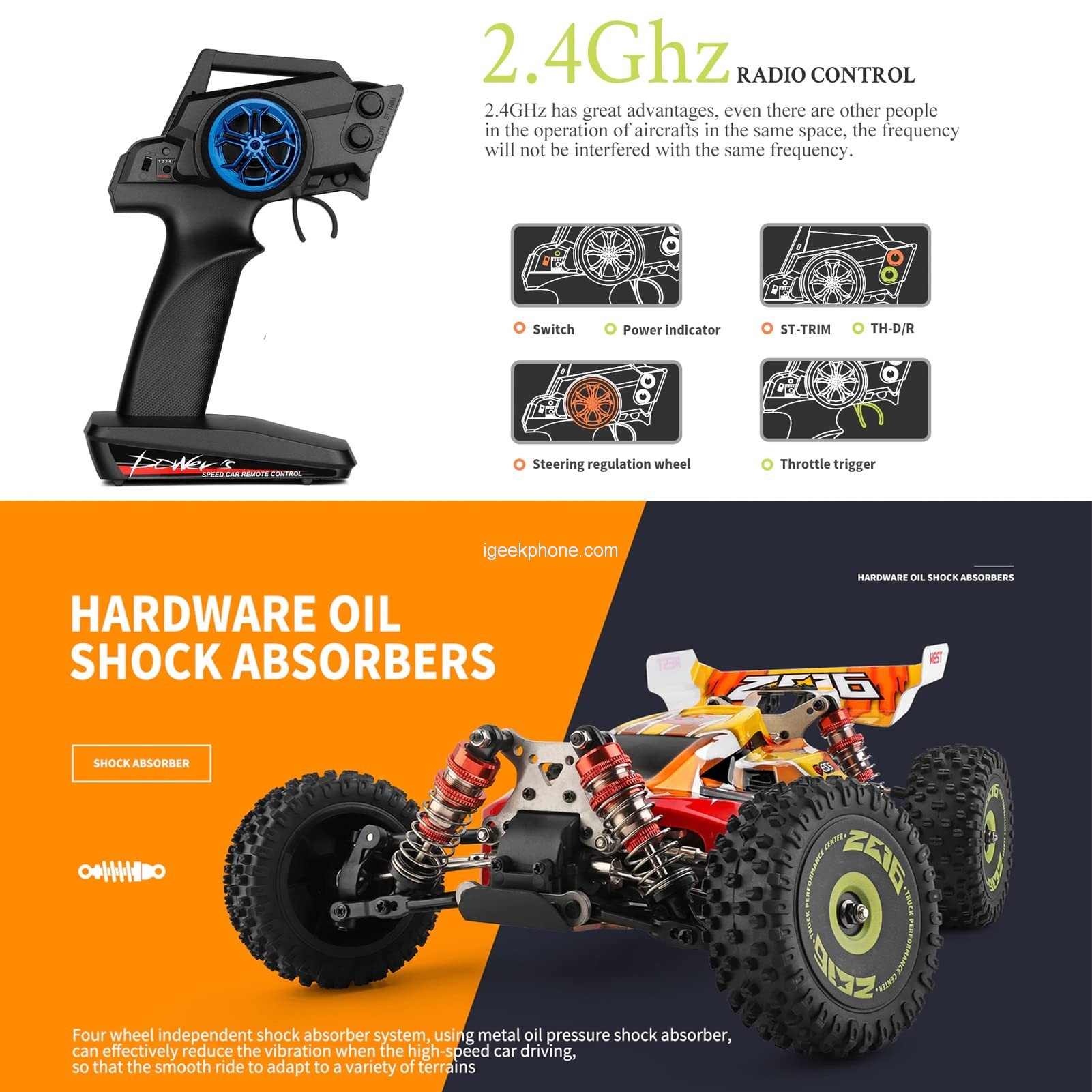 WLtoys XKS 144010 A four-wheel free safeguard framework, utilizing equipment oil safeguard, can successfully decrease the vibration while driving fast, make the ride smooth, meet impediments that can really lessen the effect force, and be versatile to different territories. 2.4GHz Radio Framework with against sticking capacity permits us to race simultaneously on a similar track. The control distance depends on 100 meters. Corresponding choke, better operability. Also, It gives you the perfect time to spend anywhere. So, what are you waiting for? You can easily buy this from Cafago at 102.79euro