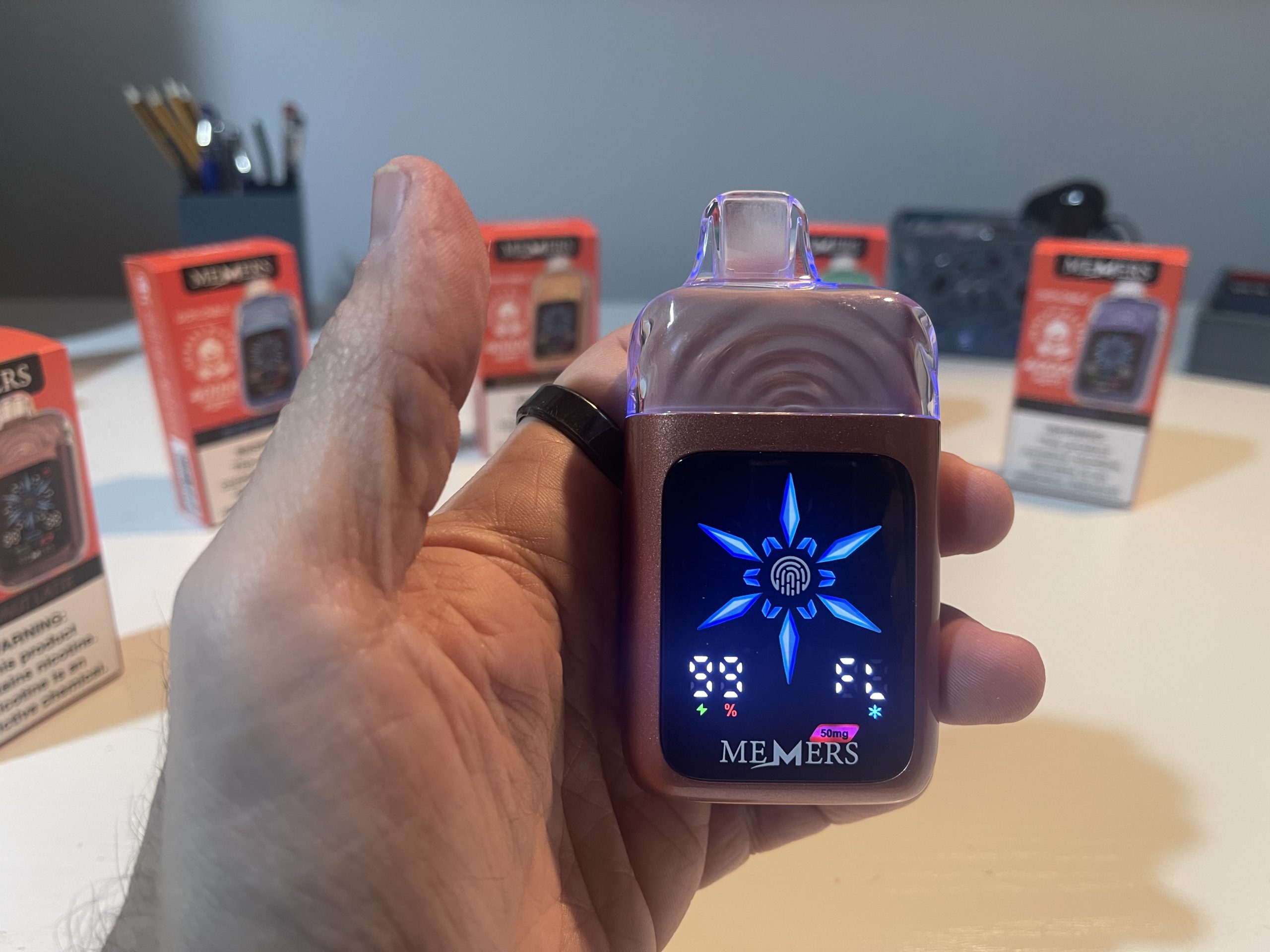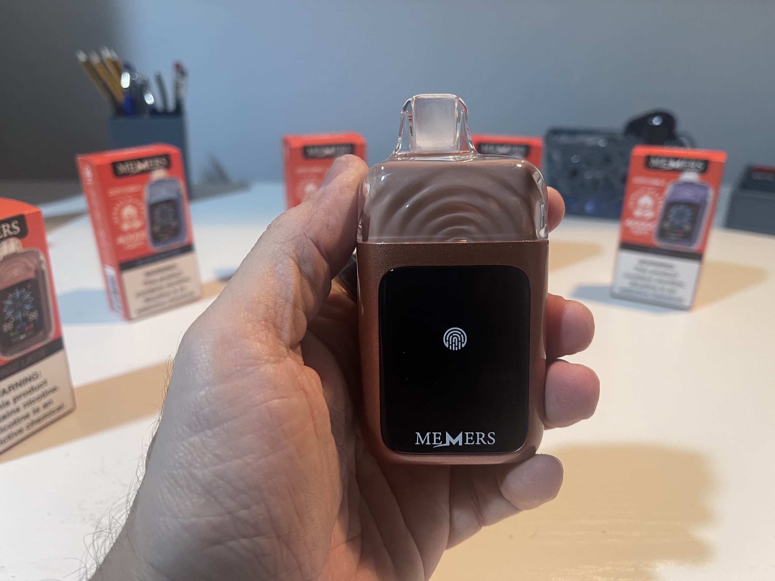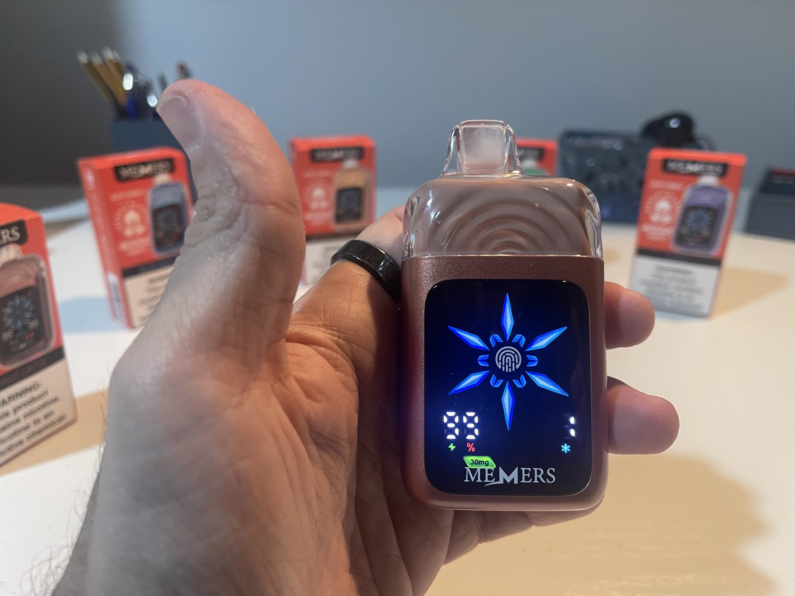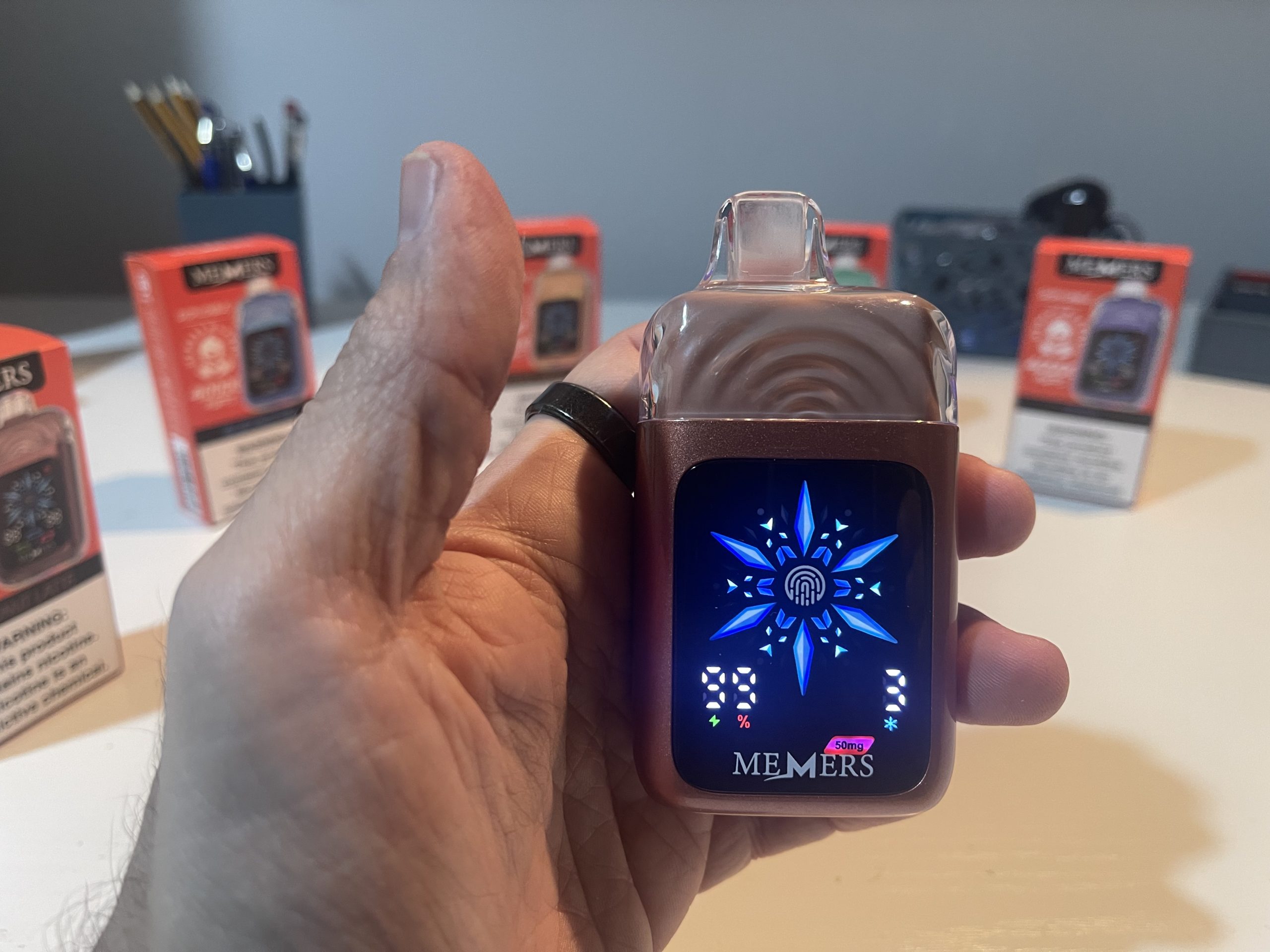 The front-facing touchscreen is intuitive, displaying essential information such as battery percentage, e-liquid level, nicotine strength, and iciness settings. The fingerprint sensor ensures quick adjustments without accidental activations, highlighting MEMERS’ attention to detail.