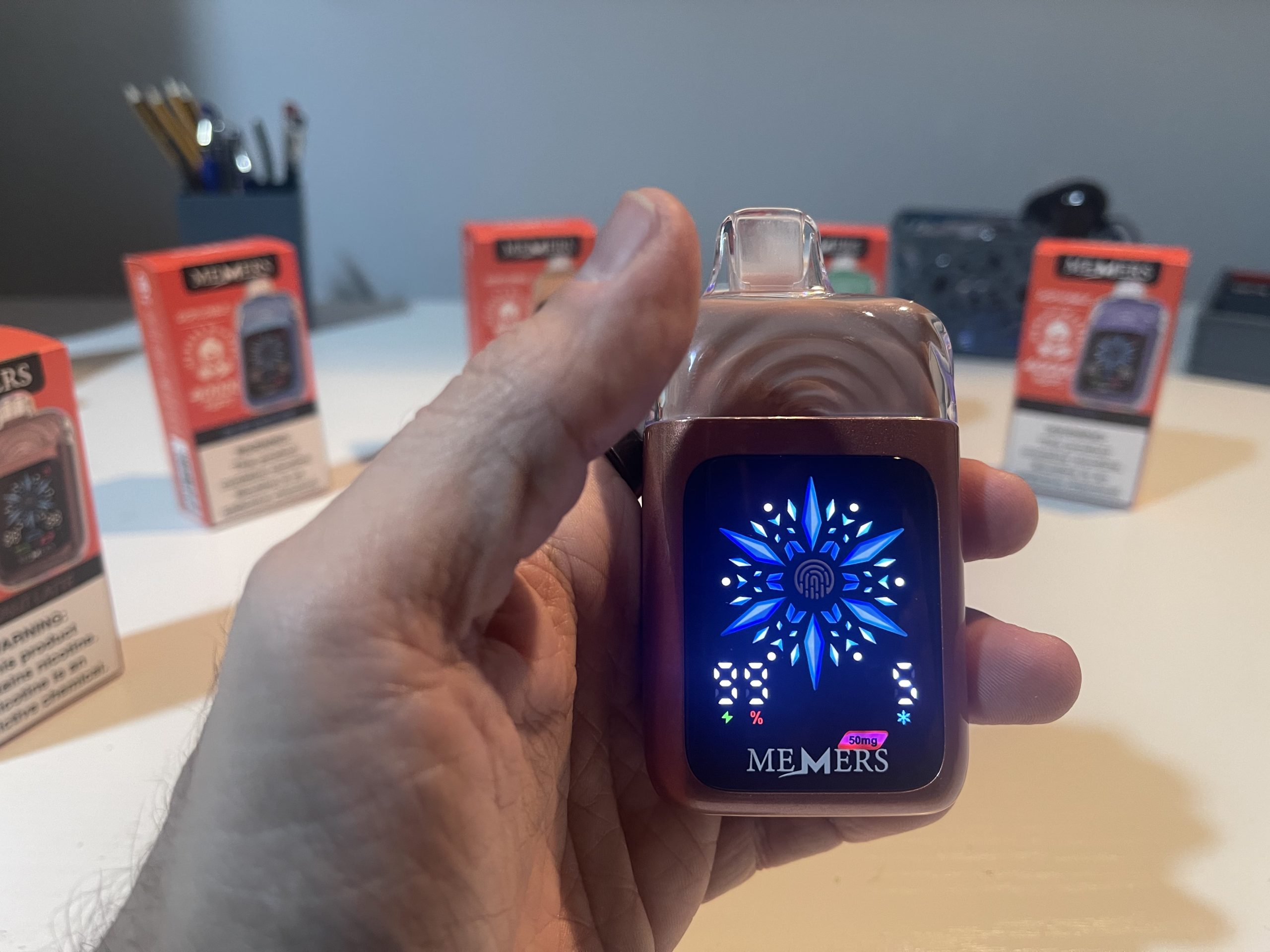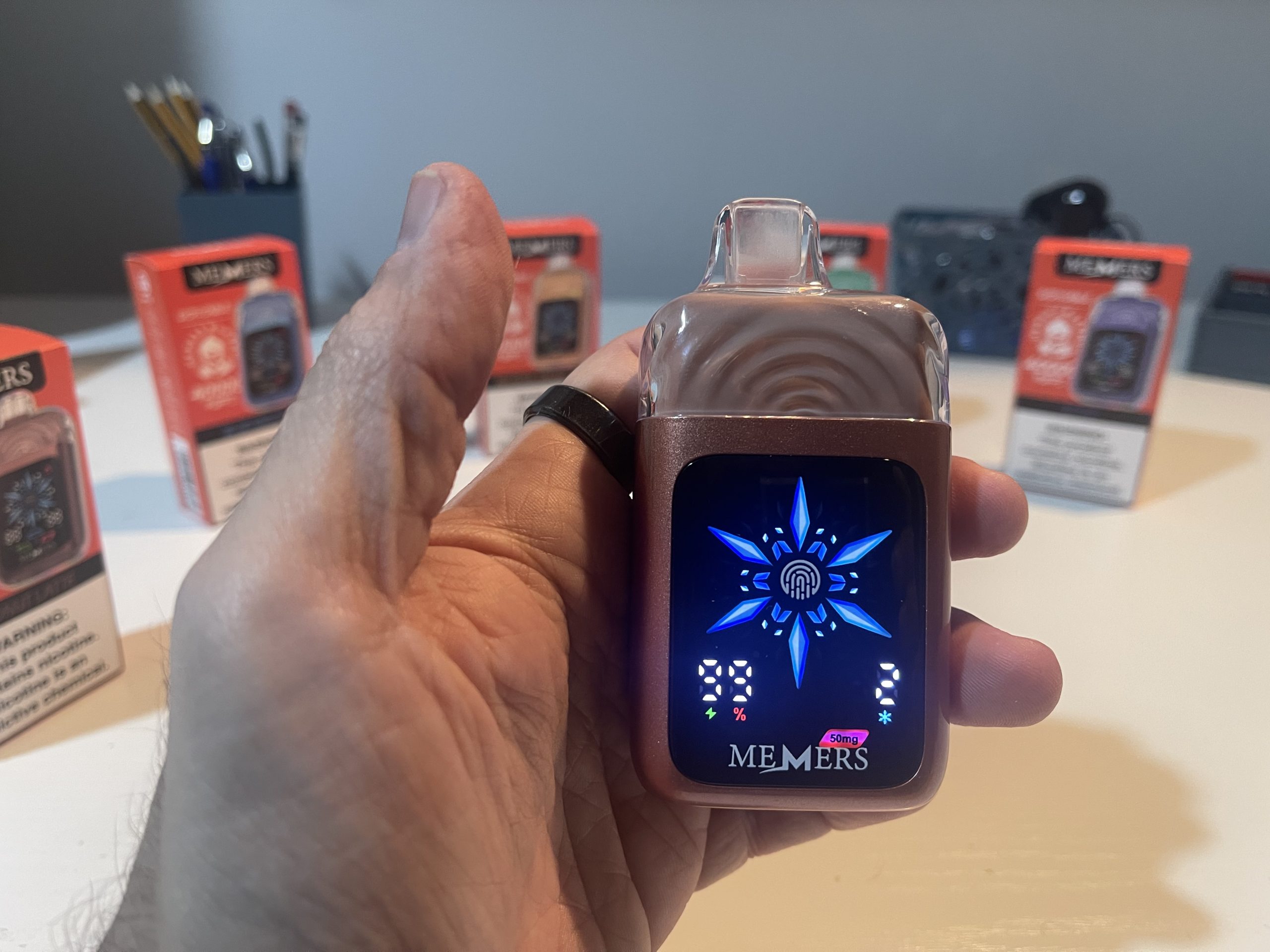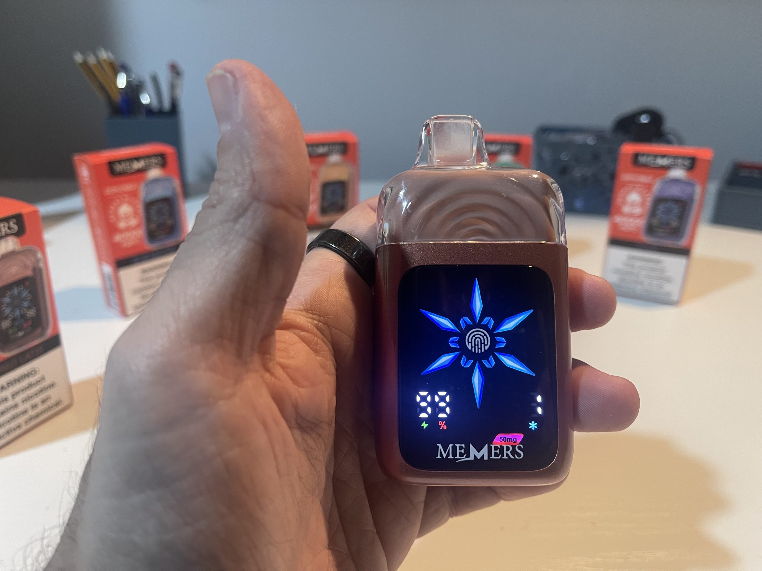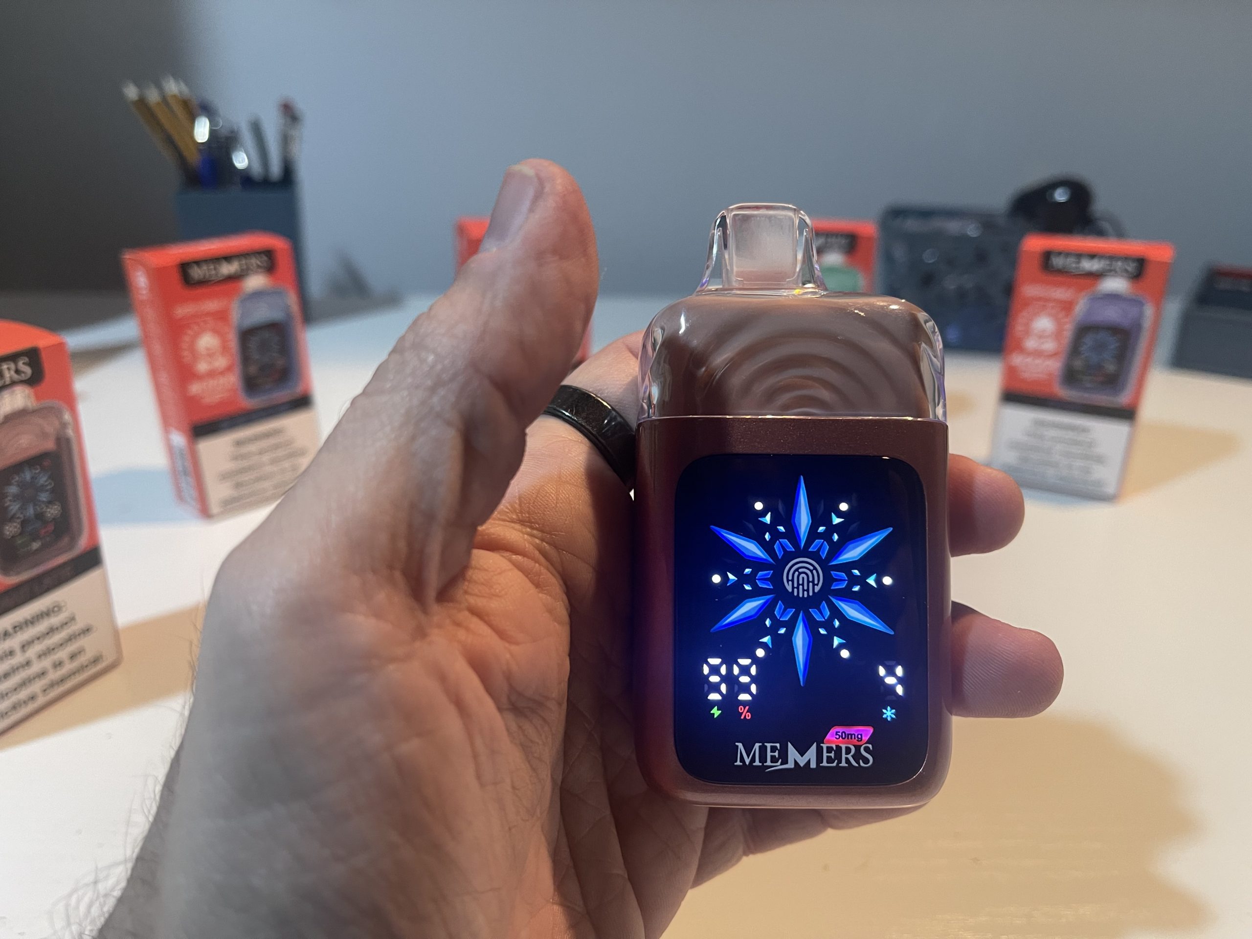 The front-facing touchscreen is intuitive, displaying essential information such as battery percentage, e-liquid level, nicotine strength, and iciness settings. The fingerprint sensor ensures quick adjustments without accidental activations, highlighting MEMERS’ attention to detail.