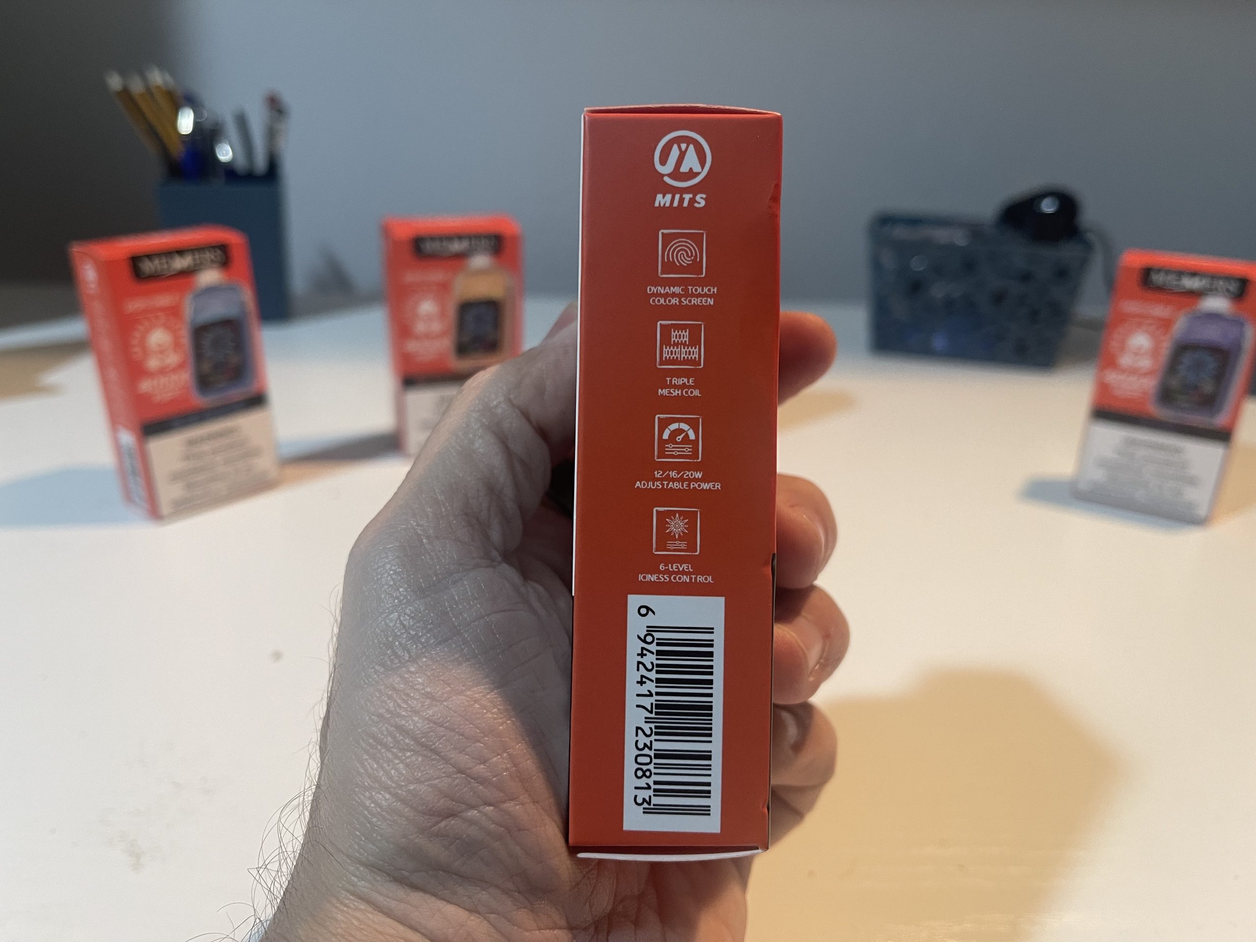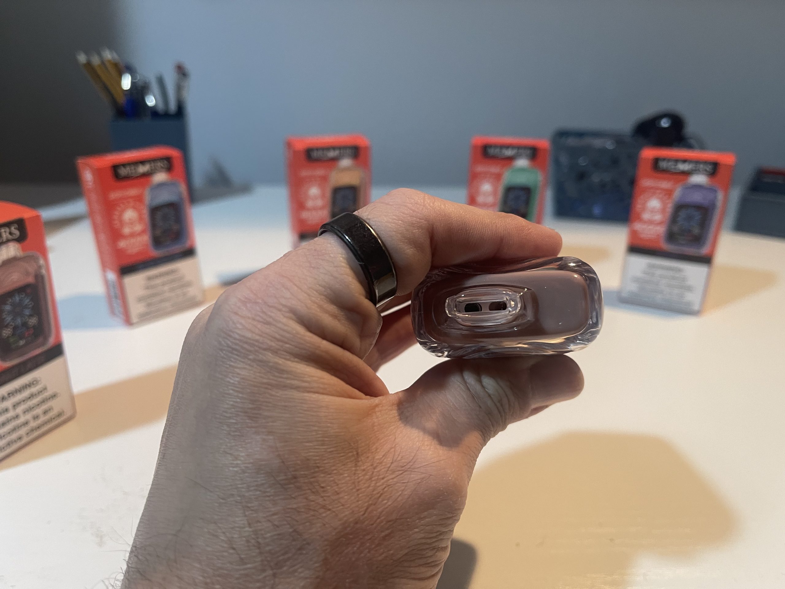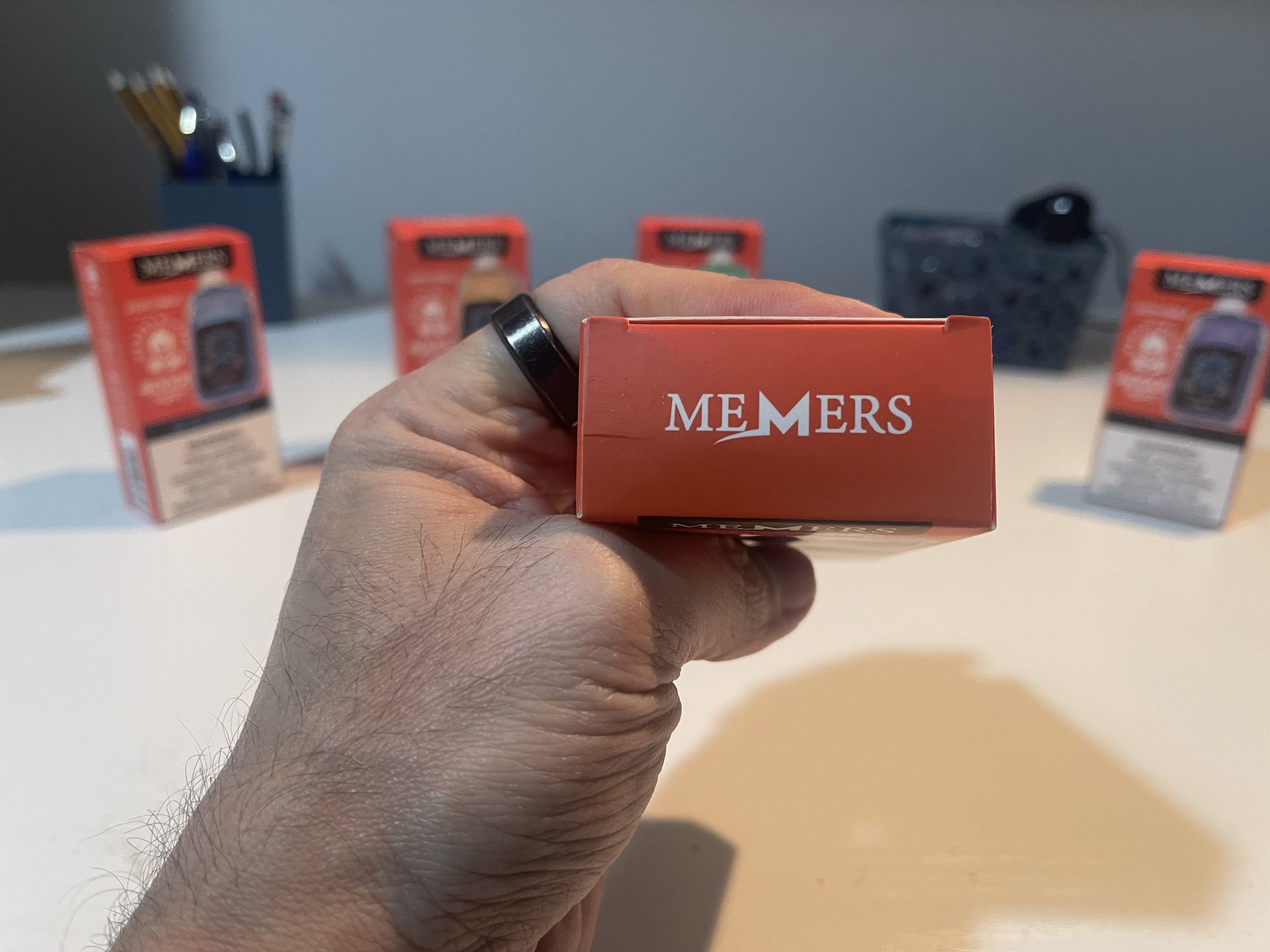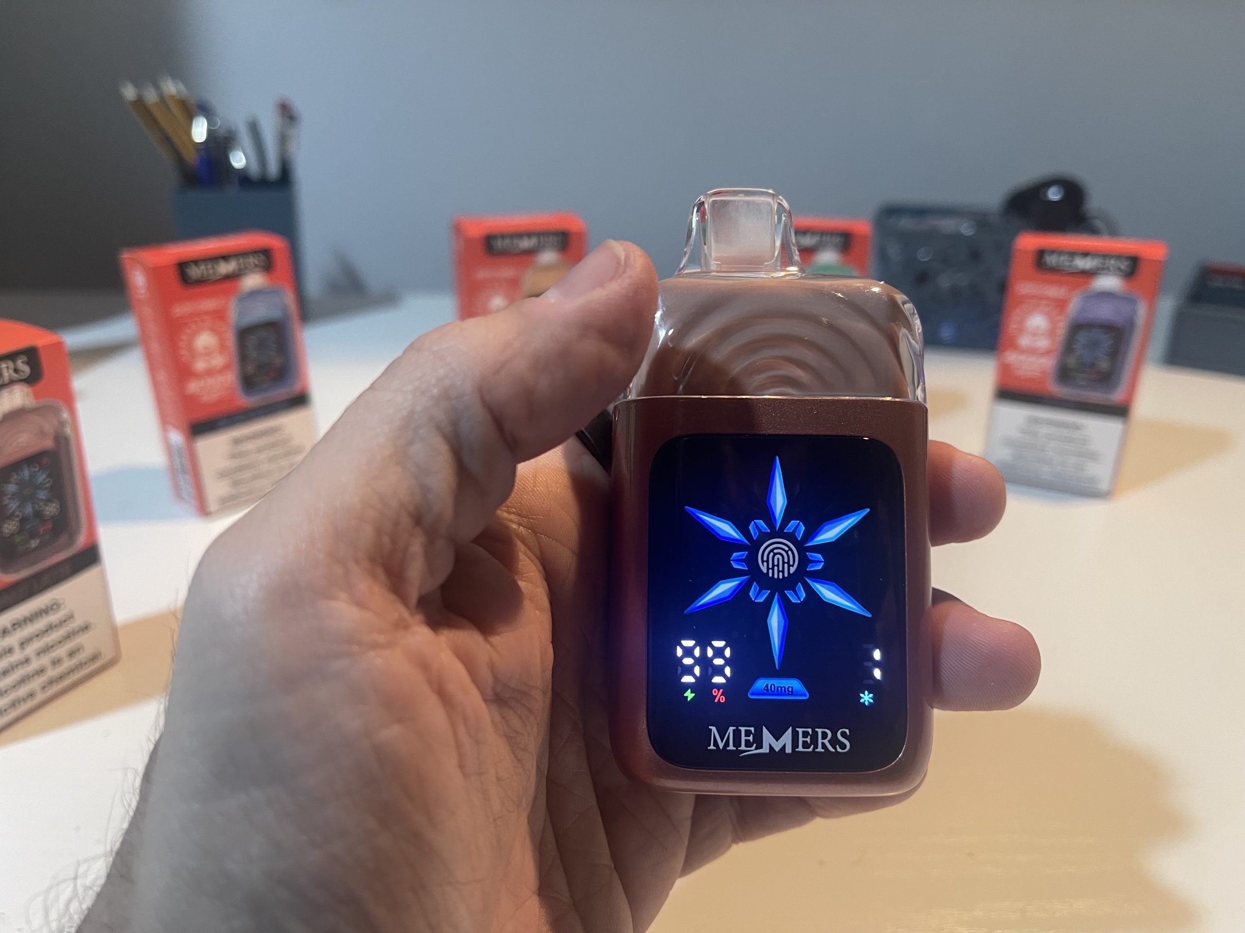 The front-facing touchscreen is intuitive, displaying essential information such as battery percentage, e-liquid level, nicotine strength, and iciness settings. The fingerprint sensor ensures quick adjustments without accidental activations, highlighting MEMERS’ attention to detail.