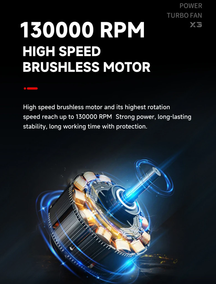 - Super Wind Speed: One of the standout features of the X3 is its incredible wind speed, reaching over 52 meters per second. It is equipped with four shark gill ventilation slots to aid in heat dissipation, protecting the fan during extended operation. This advanced design ensures the fan not only provides strong airflow but also maintains optimal performance over long periods.