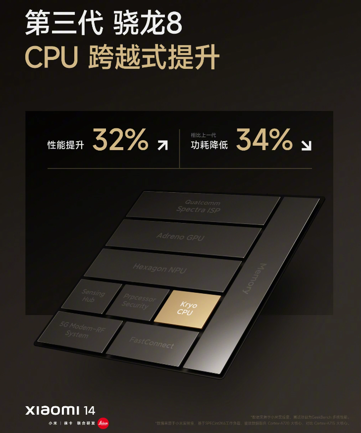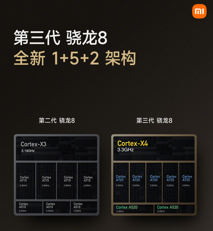 The Xiaomi Mi 14 debuts the Qualcomm Snapdragon 8 Gen 3 processor with a new 1+5+2 architecture. It includes 1× 3.3GHz Cortex-X4, 3× 3.15GHz Cortex-A720, 2× 2.96GHz Cortex-A720, and 2× 2.27GHz Cortex-A520.