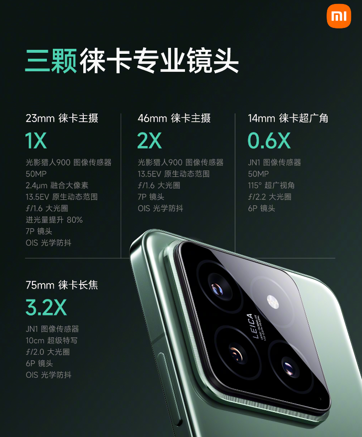 The Xiaomi Mi 14 includes a 50MP ultra-wide-angle, 50MP telephoto with OIS, and a 32MP front-facing lens. The 75mm Leica telephoto lens uses a floating lens for long shots and close-ups.