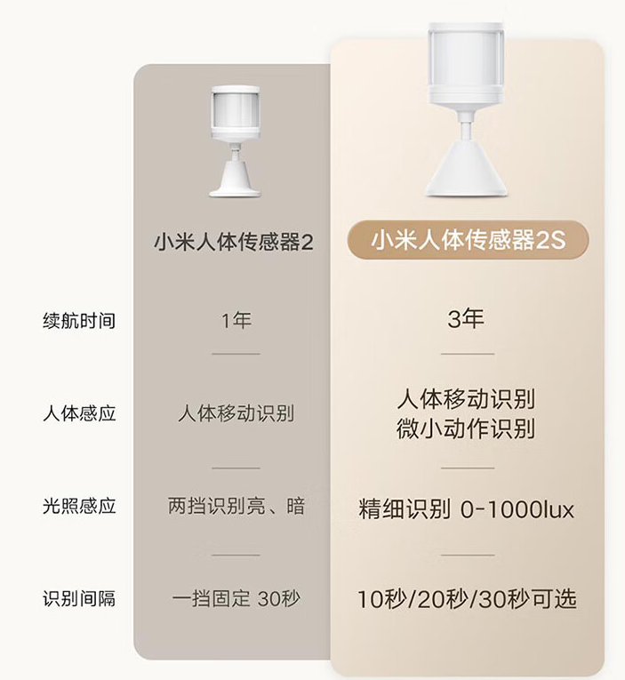 Compared with the previous generation, the 2S battery life of the Xiaomi body sensor has been upgraded from 1 year to 3 years, and the recognition of tiny movements has been upgraded on the basis of human movement recognition, and the light induction has been upgraded from two levels to fine recognition of 0-1000lux, and the recognition interval is fixed by one gear for 30 seconds. Upgrade to 10 seconds / 20 seconds / 30 seconds Optional.