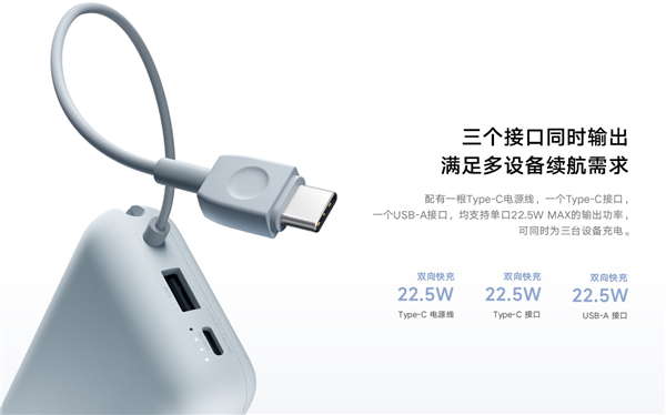 It is understood that the Type-C power cord, Type-C interface and USB-A port all support the maximum output power of 22.5W for a single port, which can charge three devices at the same time.