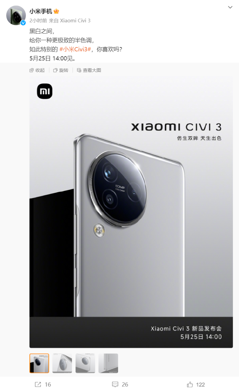 Xiaomi’s official Weibo account has announced that the Civi 3, equipped with Mediatek Dimensity 8200-Ultra chip, will be officially released on May 25.