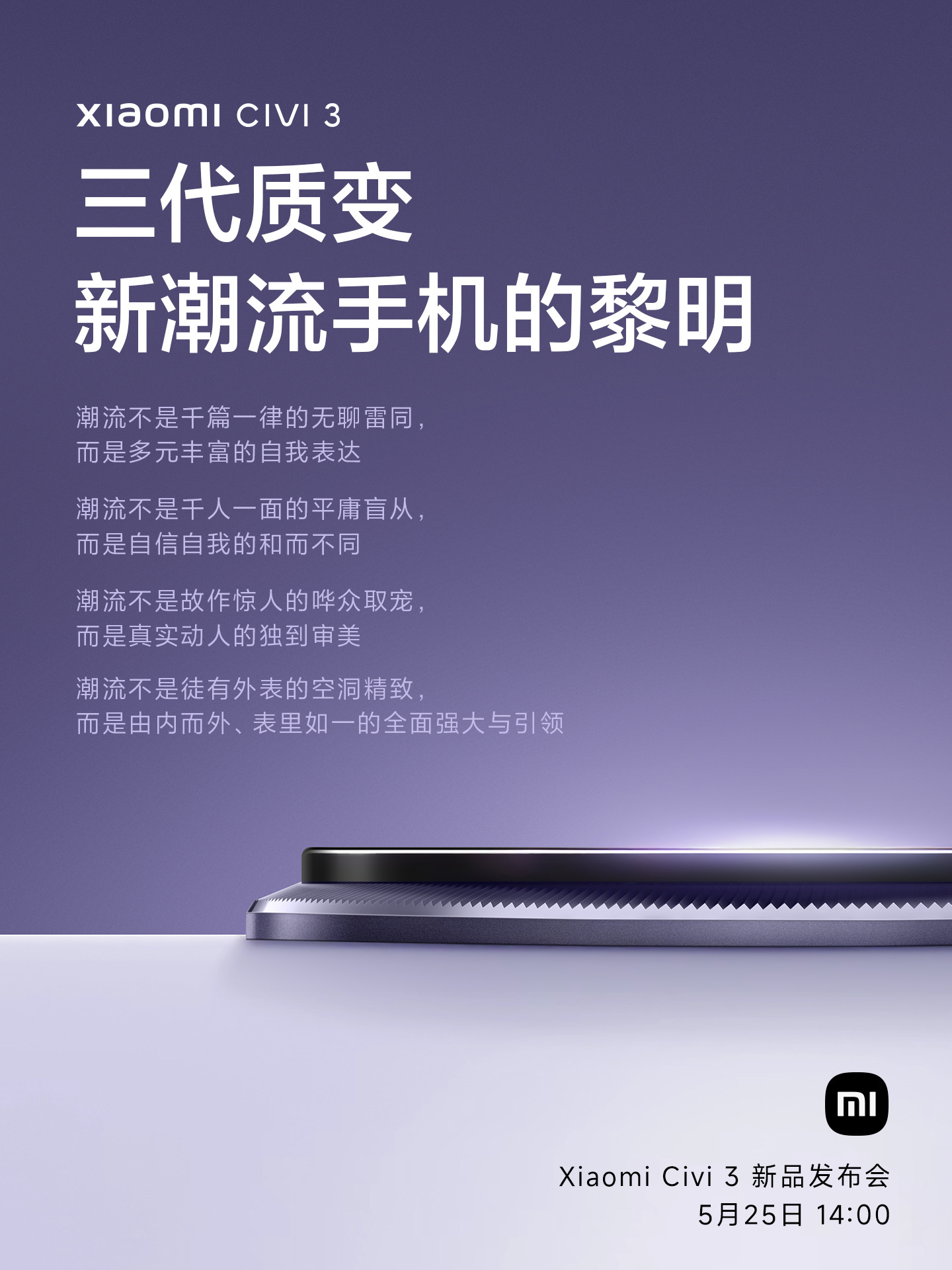 Xiaomi announced today: Xiaomi Civi 3 will be officially released on May 25, which is called “three years of exploration and transformation” and “the dawn of a new trend mobile phone”.
