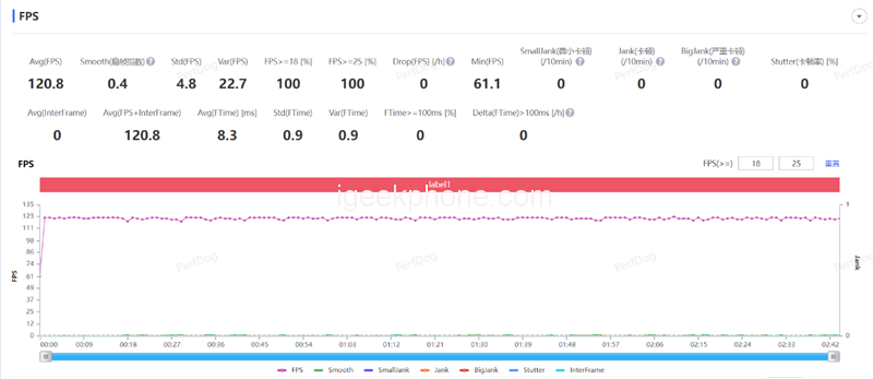 QQ Speed mobile game, with the highest special effect level and extremely high frame rate, after a game test, the average frame rate is maintained at 120.8FPS, the frame rate fluctuation is only 0.4, and the picture is very smooth during the game. The average power consumption of 3.385W, the frame energy consumption of 28mW, and its energy efficiency ratio reached 35.7.
