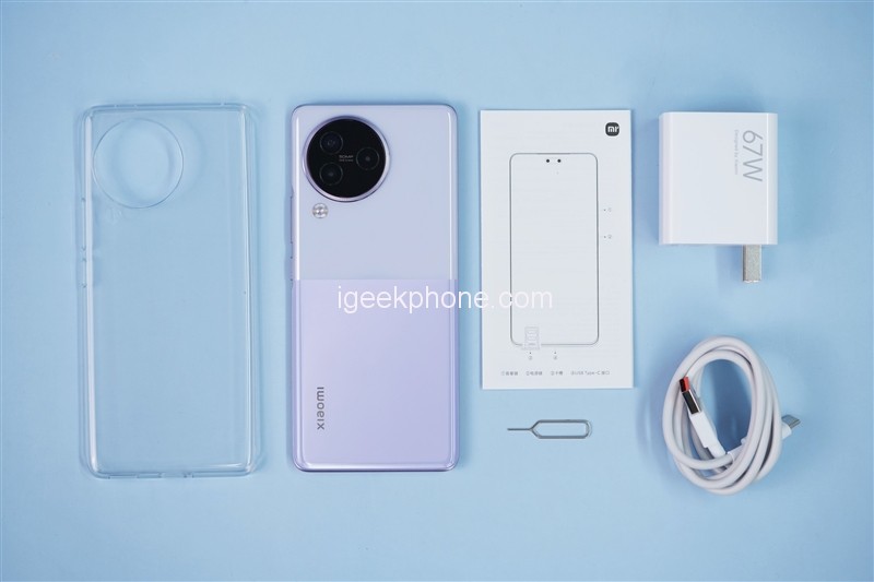 In addition to the phone body, the Xiaomi Civi 3 package also includes a transparent silicone phone case, a fast charging charger set, a quick start guide, and a SIM card pin. Xiaomi Civi 3 supports up to 67W wired fast charging, which is consistent with the previous generation Civi2.