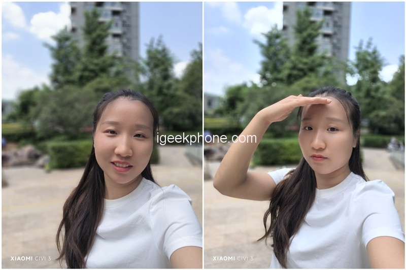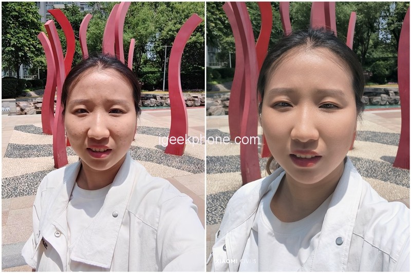 We used Xiaomi Civi 3 and a competitor’s selfie phone to take a front-end video for comparison. The left side is a screenshot of the video taken by the competitor’s model, and the right side is taken by Civi3. Both phones have turned on the beauty effect. Such a comparison makes it easy to feel that Xiaomi’s beautification does not liquefy the entire face like a friend’s business so the proofs taken in this way will lose a lot of facial details and look fake.