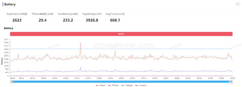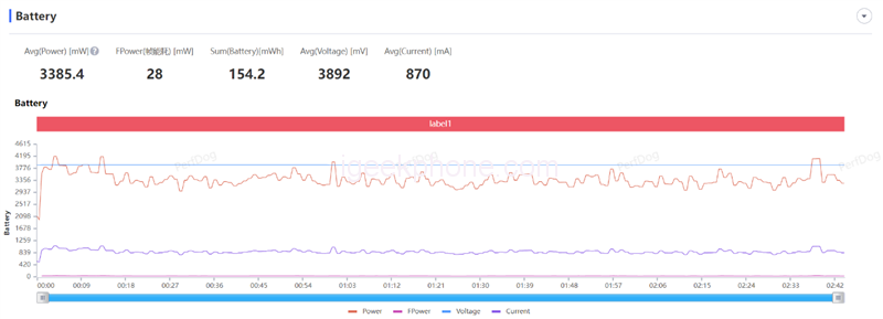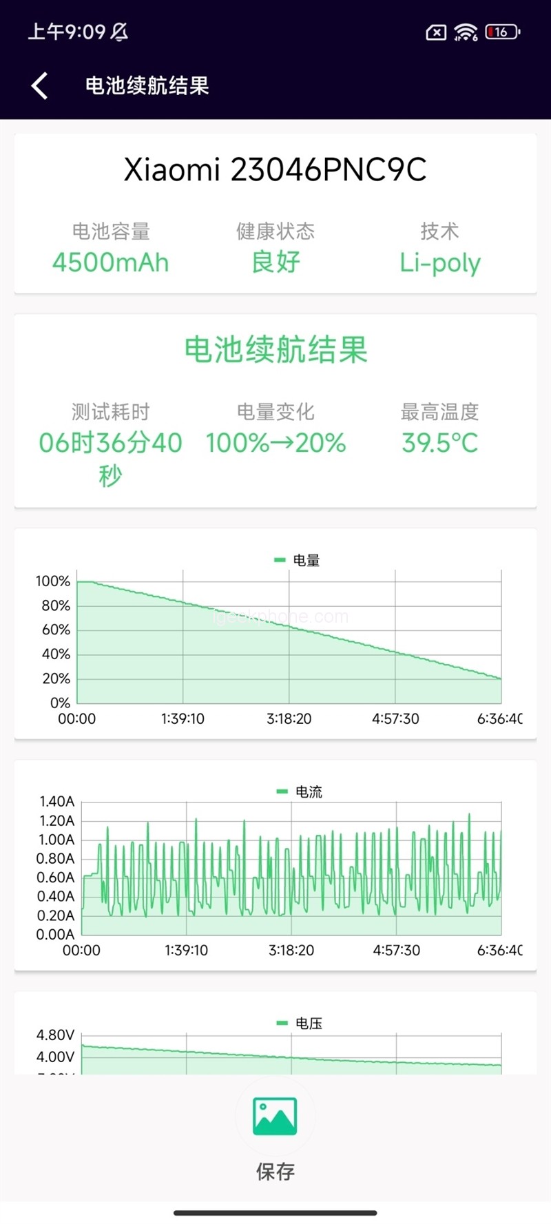 Before the test, we adjusted the power of the mobile phone to 50% and turned off the automatic brightness, adjusted the refresh rate to adaptive, turned off the performance mode, turned off all notification messages, turned off all background applications, and used the battery dog for continuous uninterrupted testing. It took 6 hours, 36 minutes, and 46 seconds for the final power consumption from 100% to 20%. After conversion, the full battery life is about 8 hours, which can support users for a whole day in daily use.