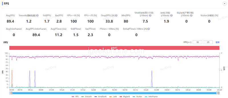 Call of Duty mobile game, in the 90FPS high frame mode, can open smooth image quality, after nearly 5 and a half minutes of a team battle test, the average frame rate of the game reached 89.4FPS, and the average fluctuation was only 1.2. Although it has dropped to 80FPS during the game, it will not cause a sense of stuttering during the experience, and the overall picture is also very coherent.