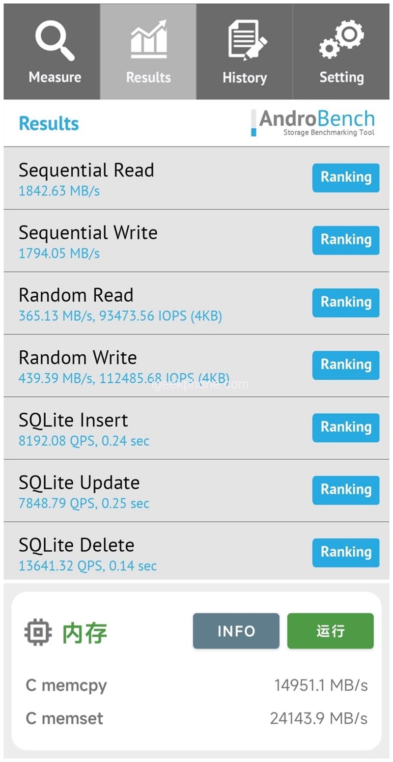 In the memory and flash memory test, the memory copy speed reached 14.9GB/s, the writing speed reached 24.1GB/s, the sequential reading speed of the flash memory reached 1842.63MB/s, the sequential writing speed was 1794.05MB/s, and the random reading speed The speed reaches 365.13MB/s, and the random write rate reaches 439.39MB/s. On the whole, it belongs to the level of LPDDR5 + UFS 3.1. It is not easy to have such a high-standard configuration in a thin and light selfie mobile phone.