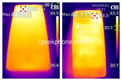 10 minutes of Yuanshin, the temperature of the front of the fuselage is 44.5 degrees Celsius, and the temperature of the back is 43.3 degrees Celsius. Although the high heat area is located around the camera, the metal frame will increase the heat transfer. At this time, you have to change the holding position before playing the game.