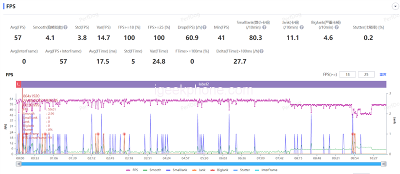 Finally, there is the heavy-loaded Yuanshen mobile game. Under the extremely high image quality + 60 frame rate, it can stabilize 60 frames in the first 8 minutes. After 8 minutes, the frame rate of the stabilization control mechanism is triggered and the frame rate drops to 55FPS. After that, the frame rate is reduced and increased. , the average frame rate of the whole game was maintained at 57FPS. In the face of such large-scale mobile games, Xiaomi Civi3, a thin and light mobile phone that mainly focuses on selfies, can also easily win.