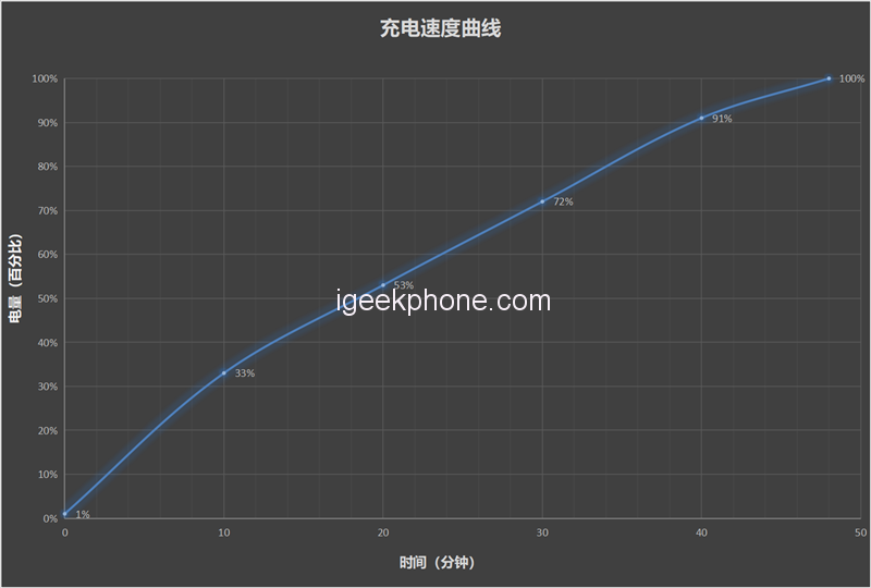The battery level was tested from 1%. The Xiaomi Civi 3 mobile phone was charged to 33% in 10 minutes, 53% in 20 minutes, and 72% in half an hour. It took a total of 48 minutes to fully charge.