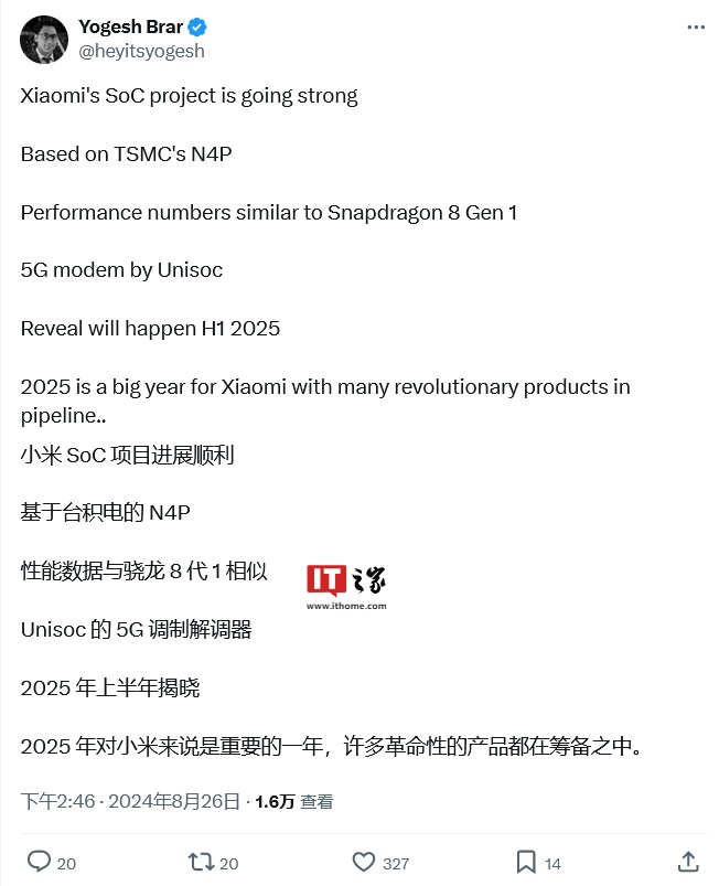 This is not the first time we have heard that Xiaomi may develop a new smartphone chip, IT House reported in February this year that Xiaomi is working with ARM to build a self-developed AP (application processor, basically equivalent to mobile device SoC).