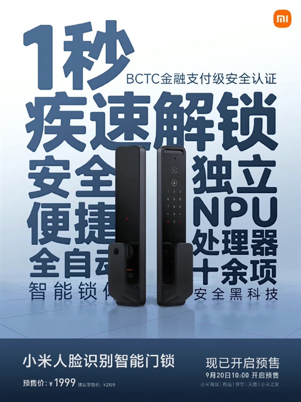 On September 20, Xiaomi face recognition smart door lock was released, all channels are now open for presale, presale price of 1999 yuan, $289.