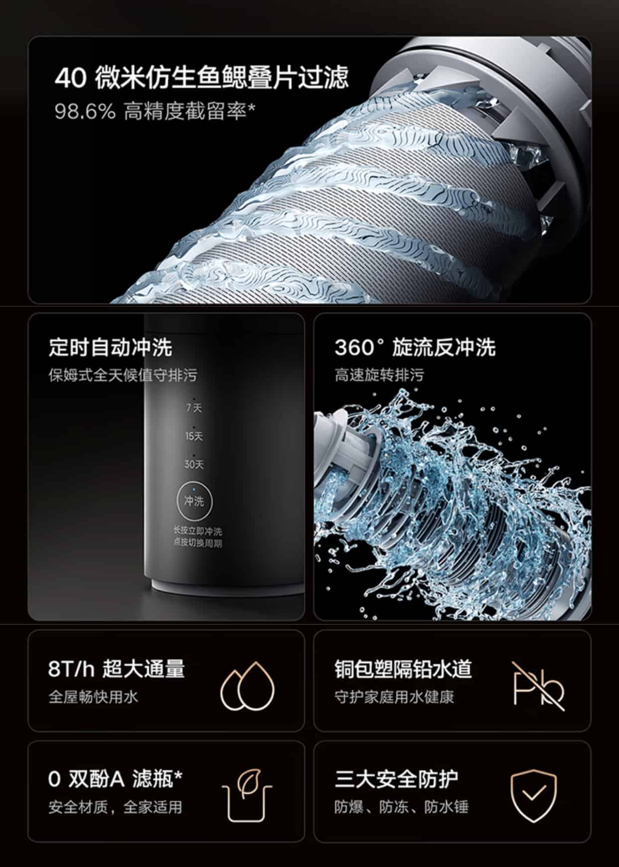 It adopts 40-micron bionic fish gills for high-precision filtration, combined with a water-driven self-cleaning system, which can achieve deep filtration at the source, automatic cleaning and flushing, and protect water-related household appliances.