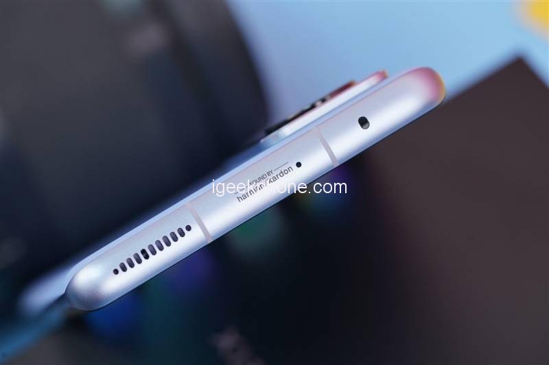 The top is equipped with a noise-canceling microphone and an infrared remote control sensor, as well as the certification mark of Harman Kardon. The Type-C interface at the bottom of the phone is shared with the headphone port, and the right side is followed by the microphone opening and the SIM card slot.