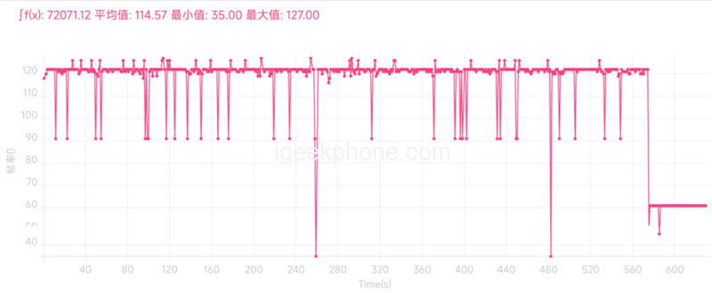 “Honor of Kings” supports the highest picture quality and 120-frame mode. After opening, it will play for nearly 10 minutes. The average frame rate is 114.57 FPS, and the frame rate does not fluctuate much.