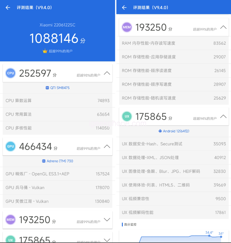The first is the comprehensive test of AnTuTu. The Xiaomi Mi 12S Pro easily achieved a total score of 1,088,146, which is a significant improvement compared to the previous generation’s reluctant score of 1,029,002. From the detailed sub-items, the CPU performance has changed the most, with an increase of up to 10%.