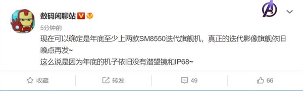 Today, blogger @digitchat revealed that there will be two second-generation Snapdragon 8 flagships released by the end of 2022, and neither of them will have a submersed-view telephoto lens, nor will they support IP68 dustproof and waterproof.