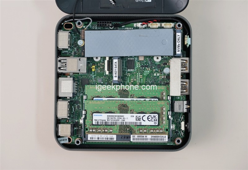Next to it is the ITX case made by Xianmaqu. When you disassemble the host, you can see 2 SO-DIMM slots, 1 M.2 2280 and 1 M.2 2242. Generally speaking, the capacity can meet the needs of most office users.