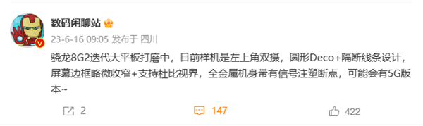According to the blogger “digital chat station” revealed that there is currently a second-generation Snapdragon 8 mobile platform Android tablet is being prepared, will use a full-metal body, rear circular double camera, using partition line design.