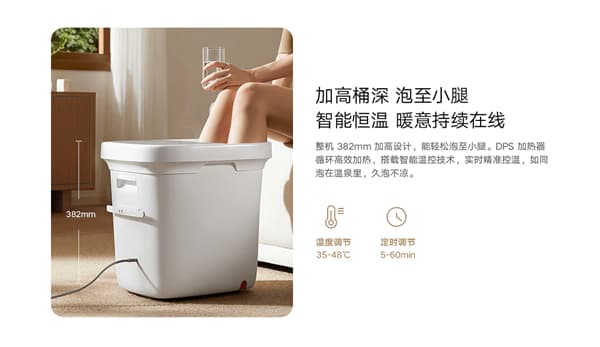 The whole machine is designed with a 382mm height increase, allowing it to soak up to the calves. The temperature adjustment range is 35-48℃, and it supports intelligent temperature control technology, ensuring it doesn’t get cold even after long soaking.