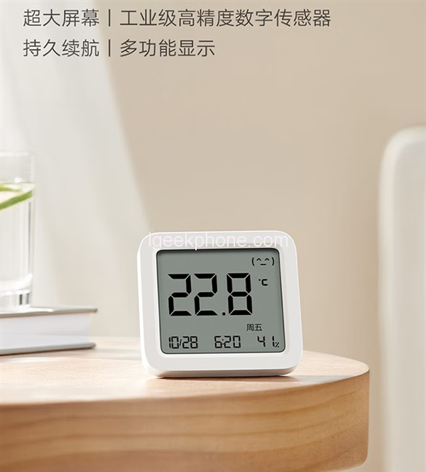 It is understood that the Xiaomi Mijia Smart Thermo Hygrometer 3 uses a 62.6*53.2mm large-size LCD screen to present data in a segment code display. Six functions can be displayed on one screen, including temperature, humidity, comfort, time, date, and Week.