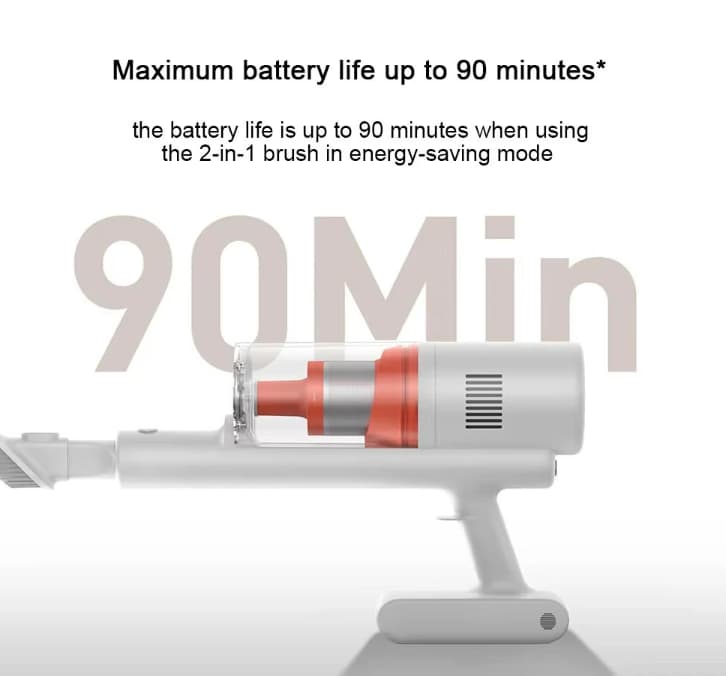 90-Minute Marathon Runtime: Forget constantly searching for the charger. Equipped with a high-capacity battery, the Mijia Vacuum 3 boasts up to 90 minutes of continuous runtime on a single charge in its standard mode. This is ample time to clean large apartments or multi-room homes without interruption. (Runtime varies based on suction mode and attachments used).